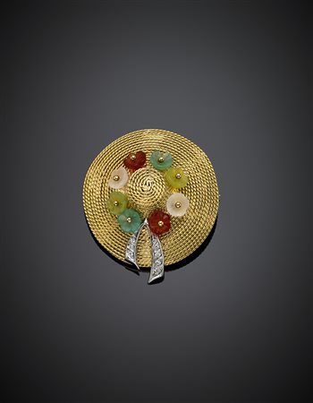 Spilla/pendente in oro giallo a guisa di cappello di paglia con fiori in quarzo microcristallino e rifinito in diamanti, g 19,81, lungh. cm 5,40, largh. cm 3,90 circa. Marcato Vergano.