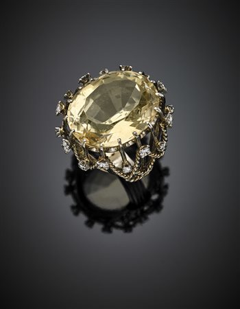 Lotto 1162 Anello in oro giallo a cestino con quarzo citrino ovale e diamanti per complessivi ct. 0,70 circa, g 17,56 misura 11/51.