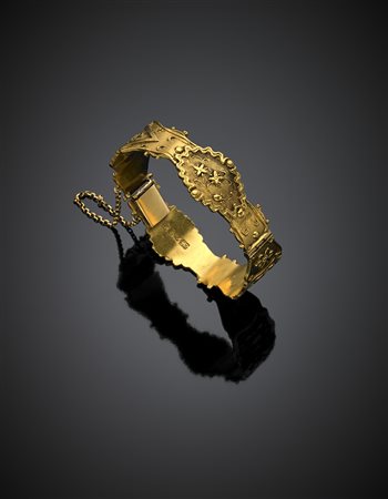 Lotto 1163 Bracciale rigido, apribile in oro giallo cesellato e battuto, g 46,67, diam. cm 5,5. Punzoni cinesi. (difetti)