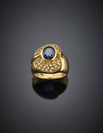 Lotto 1164 Anello in oro giallo con zaffiro ovale di ct. 2,30 circa e piccoli diamanti a rifinirlo, g 11,43 misura 16/56.
