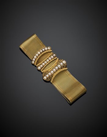 Yellow gold band bracelet with half pearls and black enamel, g 50.23, width cm 3, diam. cm 6.5 circa. French hallmarks. (slight defects) -