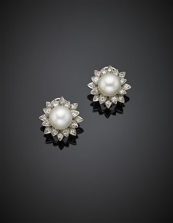 Button pearl, diamond and platinum flower earrings, in all ct. 0.70 circa, g 13.04, diam. cm 1.80. -
