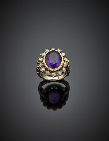 Oval ct. 4.20 circa amethyst and diamond yellow chiselled gold cluster ring, diamonds in all ct. 0.50 circa, g 10.32 size 11/51. -