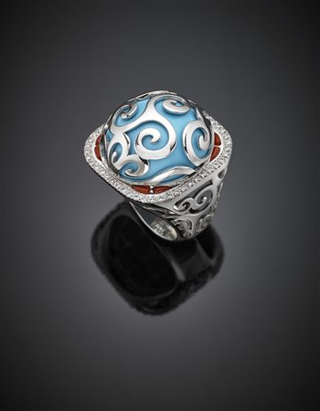 White gold turquoise paste ring, diamond and coral details, g 19.86 size 16/56. Marked 2297 MI. With original guarantee