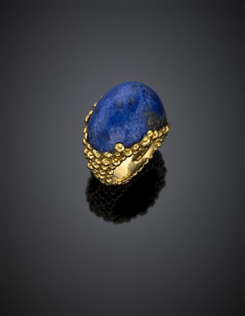 Yellow gold grainy ring lapis with sugar loaf, g 17.58 size 13/53. Signed Kutchinsky. -
