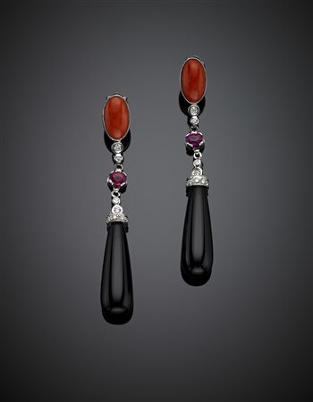 Lotto 1174 Orecchini pendenti in oro bianco con corallo ovale e rubini a sostenere due gocce di onice, dettagli in diamanti, g 13,86, lungh. cm 7,2 circa.