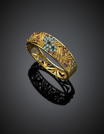 Yellow 14K gold openwork cuff bracelet with oval opals and synthetic rubies, black enamel details, g 37.06, diam. cm 6.3.
