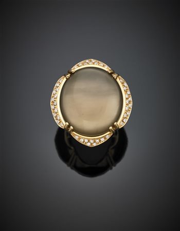 Yellow gold diamond ring with great quartz and mother-of-pearl composite stone, g 21.42 size 14/54. Signed Brusidue. -