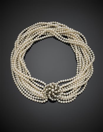 Lotto 701 Collana a undici fili di perle d'acqua dolce coltivate di mm 5/5,50 circa con chiusura in oro bianco e perle, g 220,63, lungh. cm 44 circa.