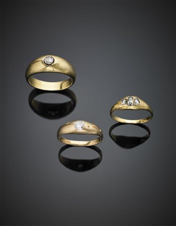Lotto 702 Lotto di tre anelli in oro giallo e diamanti di forme e tagli differenti, misure tra 15/55 e 22/62, complessivi g 14,04.