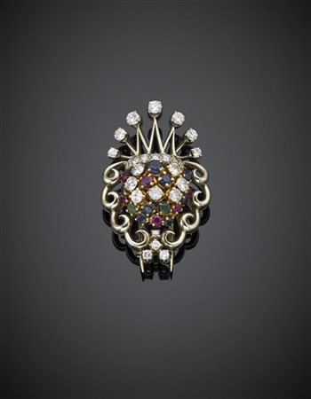 Diamond, ruby, sapphire and emerald bi-coloured gold coat of arms brooch, g 14.80, length cm 3.90 circa. Marked 351 MI. -