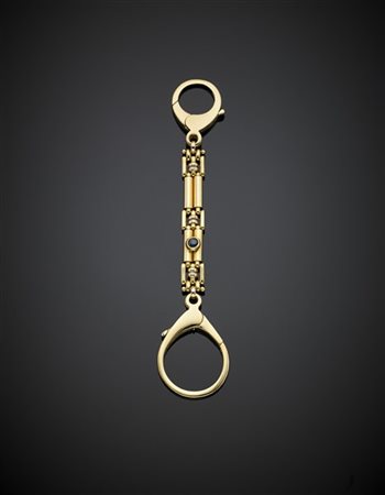 Portachiavi in oro giallo con piccolo zaffiro cabochon, dettaglio in oro bianco, g 16,88, lungh. cm 10,10 circa. Firmato e marcato Polese, 604 NA, 1562 VI.