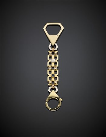 Portachiavi in oro giallo, bianco e rosa con piccolo zaffiro cabochon, g 23,67, lungh. cm 10,10 circa. Firmato e marcato Polese, 604 NA, 1562 VI.