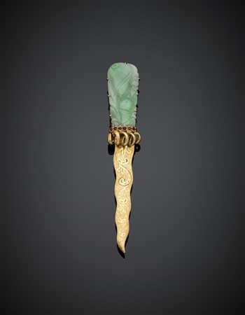 Lotto 709 Spilla in oro giallo cesellato e giadeite scolpita a guisa di pugnale, rifinita con rubini, g 21,68, lungh. cm 9,70 circa. Marchi italiani incompleti.