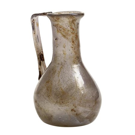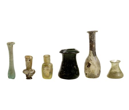 Due unguentari con lungo collo cilindrico e orlo estroflesso con labbro ripiegato, uno a corpo cilindrico, l'altro tubolare, un flacone quadrangolare, una brocchetta miniaturistica, un'olletta a corpo conico, un unguentario a corpo campanulato(6)
