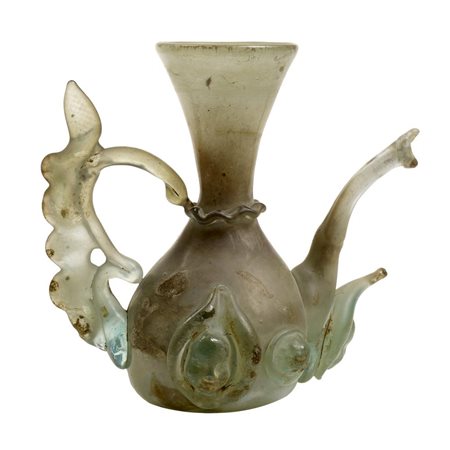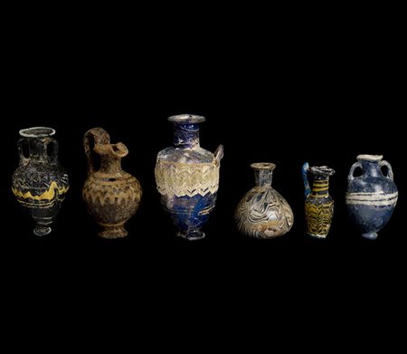 MATERIA E TECNICA: pasta vitrea blu cobalto, bianca, turchese e gialla modellata su nucleo friabile Hydria con bocchello circolare, breve collo cilindrico, corpo ovoide, piede troncoconico, un'ansa a bastoncello verticale dalla spalla al collo e due piccole anse a bastoncello orizzontali e ritorte verso l'alto; due amphoriskoi con bocchello circolare, breve collo troncoconico, corpo ovoide, peduccio a bottone, anse verticali a bastoncello dal collo alla spalla, oinochoe a bocca trilobata, collo cilindrico, corpo globulare, piede troncoconico ansa a nastro verticale e sormontante, olpe con bocchello circolare, collo cilindrico, corpo troncoconico, piede ad anello, ansa a nastro verticale; bottiglia con bocchello circolare, collo cilindrico, corpo piriforme, fondo concavo (6)