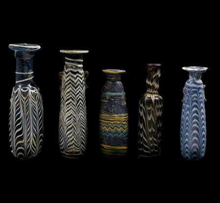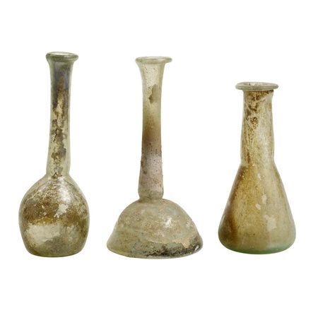 Tre unguentari con lungo collo cilindrico e orlo estroflesso con labbro ripiegato, uno a corpo piriforme, uno troncoconico e l'ultimo a corpo ovoide, fondo concavo (3)