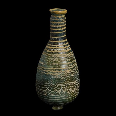 DECORAZIONE: bocchello, collo e corpo decorati con l'inserimento di filamenti di pasta vitrea bianca, azzurra, turchese e gialla che forma un motivo ad onde sul fondo blu