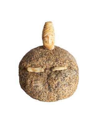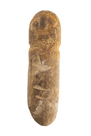 Figura umana fortemente stilizzata di forma vagamente cilindrica con indicazione di occhi, naso, bocca e barba, destinata probabilmente ad essere infissa direttamente nel terreno.