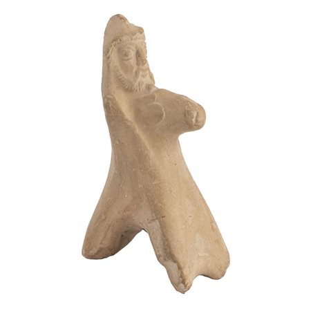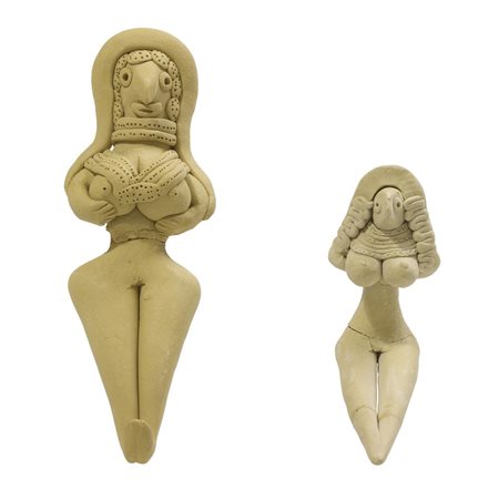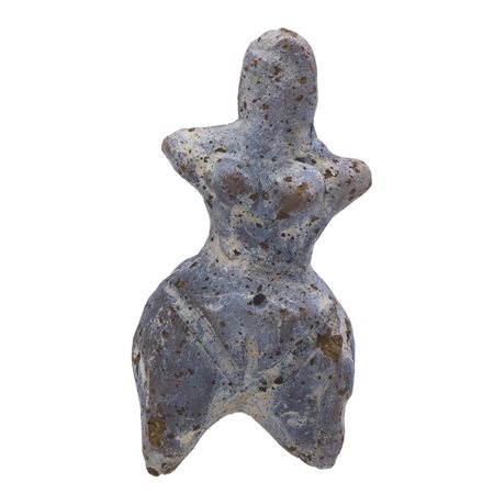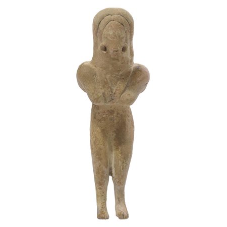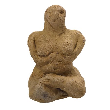 Statuetta di dea madre steatopigia seduta raffigurata stante con le gambe incrociate e con braccia, gambe, seni e sesso stilizzati; le braccia sono portate in avanti a sostenere i seni