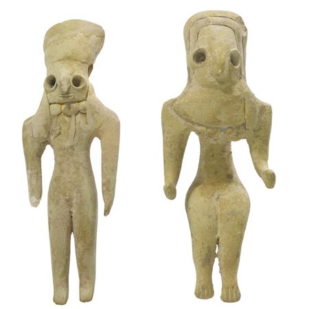 Due figure con teste stilizzate e becchi di uccello, nude con collane, una femminile con braccia protese in posizione seduta ed una maschile con braccia stese lungo i fianchi ed alto copricapo e collana con pendenti