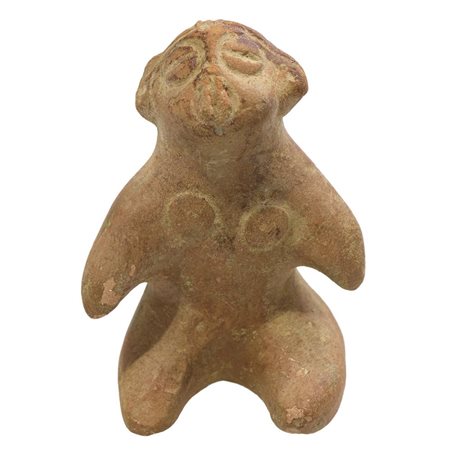 Statuetta rituale in forma di scimmia femmina seduta con gli arti superiori protesi, fortemente stilizzata con seni in evidenza e bocca a vulva stilizzata