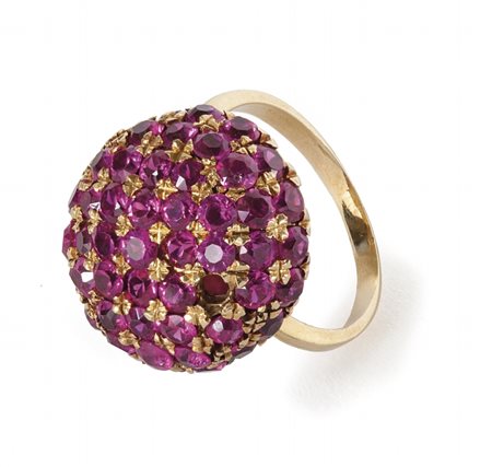 Lotto 2001 Annello in oro giallo a forma di mora con incastonati rubini di sintesi
