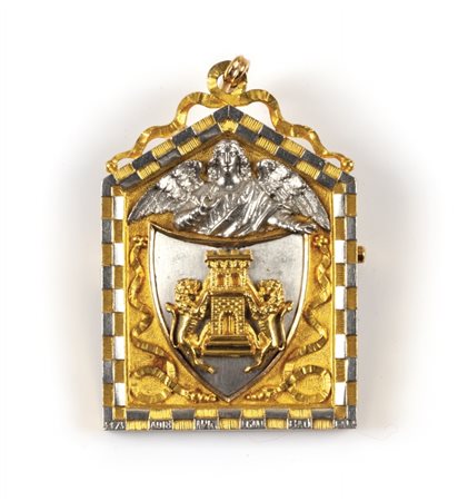 Lotto 2007 Spilla/ciondolo portafoto epoca'800 in oro bianco e giallo finemente lavorato a cesello raffigurante blasone