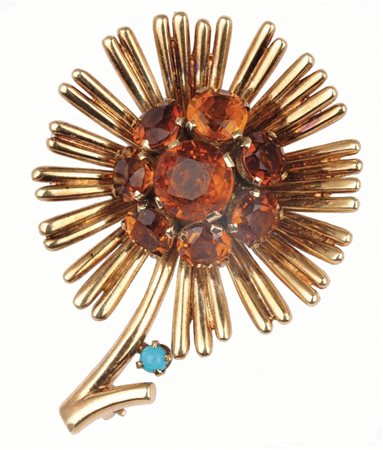Lotto 2009 Piccola parure anni'40 in oro giallo formata da un paio di orecchini ed una spilla a forma di fiore con incastonati topazi gialli ed una piccola turchese