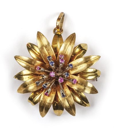 Lotto 2010 Ciondolo in oro giallo a forma di girasole con pistilli sui quali sono incastonati piccoli rubini e piccoli zaffiri