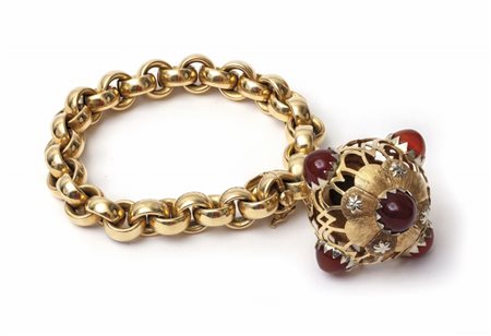 Lotto 2011 Bracciale in oro giallo maglia rolò portante ciondolo a forma di 'MINA' sulla quale sono incastonati cabochon di corniola