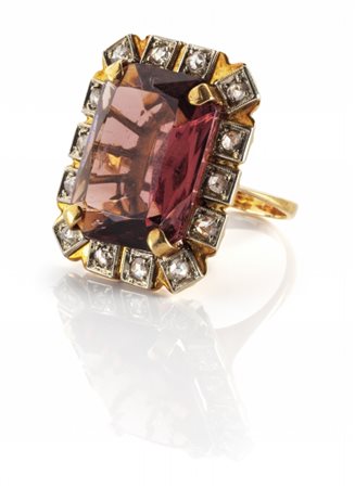 Lotto 2013 Anello in oro giallo epoca anni'40 con incastonata ametista taglio ottagonale contornata da diamanti taglio rosetta