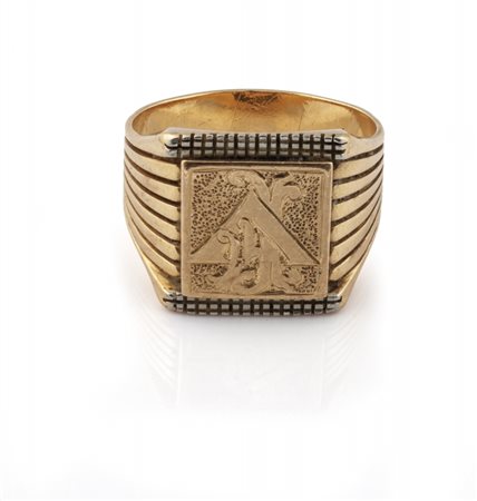 Lotto 2014 Anello in oro giallo e bianco a forma di scudo con monogramma F.V.
