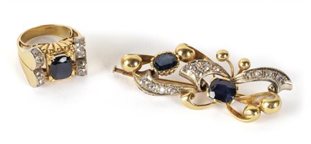 Lotto 2015 Parure epoca anni'40 composta da spilla e anello in oro giallo e bianco con incastonati zaffiri naturali per tot ct 6 00 circa e diamanti naturali vecchio taglio per tot ct 1 00 circa