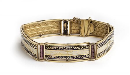 Lotto 2018 Bracciale epoca Liberty in oro giallo con incastonate ametiste e decorato con smalti bianchi e blu