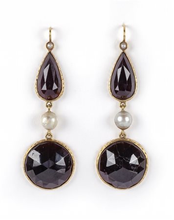 Lotto 2019 Piccola parure in oro giallo basso titolo formata da orecchini di forma pendente e spilla con incastonati granati taglio briolette di forma rotonda e a goccia contornati da piccole perle naturali
