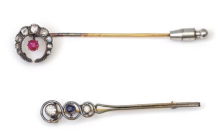 Lotto 2020 Lotto composto da due spille da cravatta epoca'800 in oro e argento con incastonate rosette di brillante e pietre di sintesi