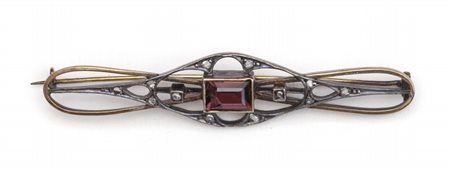 Lotto 2021 Spilla in oro giallo ed argento epoca Liberty con incastonato un granato taglio rettangolare e piccole rosette di diamante