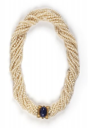 Lotto 2022 Torsade composta da dodici fili di perle d'acqua dolce ed una chiusura in oro giallo lavorata a filigrana portante lapislazzulo taglio cabochon