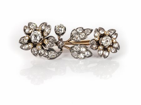 Lotto 2023 Spilla epoca'800 a forma di piccolo tralcio di fiori e foglie con incastonati diamanti vecchio taglio e taglio rosetta per tot ct 1 00 circa