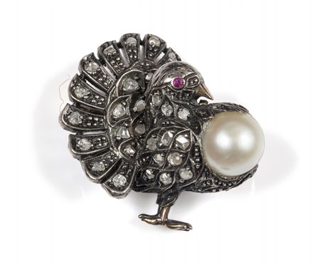 Lotto 2024 Spilla epoca Liberty in argento e oro giallo a forma di pavone con montata una perla di mm 8 e piccole rosette di diamante