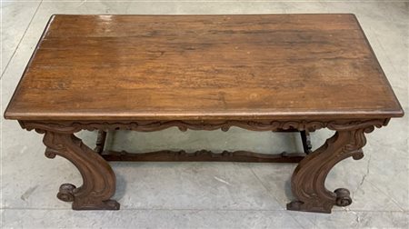 Lotto 1 Tavolino da centro in legno con fascia e gambe sagomate e intagliate (cm 130x72x61) (difetti)