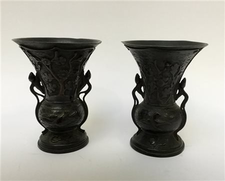 Lotto 4 Coppia di vasetti biansati in bronzo decorati in rilievo con rami fioriti (h cm 19) (difetti)