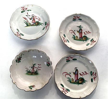 Lotto 9 Manifattura francese, secolo XVIII. Gruppo di tre piattini e un'alzatina in maiolica decorati a personaggi orientali (misure diverse, difetti e restauri)