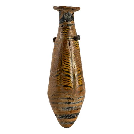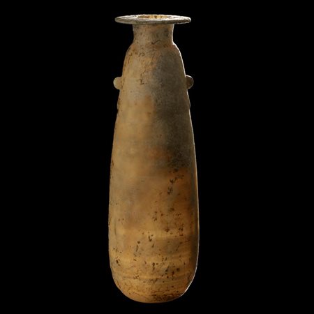 Unguentario da atleta ad anforetta con orlo a colletto, collo cilindrico a profilo concavo indistinto dal corpo piriforme, fondo piatto; anse a bastoncello impostate verticalmente dal collo alla spalla