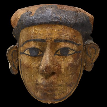 Maschera di sarcofago raffigurante un volto maschile dipinto in ocra con fazzoletto nemes sulla testa; il viso è caratterizzato da grandi occhi amigdaloidi allungati, le sopracciglia ed il contorno degli occhi sono sottolineati dal bistro, il naso è rettilineo e la bocca con labbra carnose socchiuse; ai lati del viso un sottile filo di barba nera; le grandi orecchie fuoriescono dal fazzoletto
