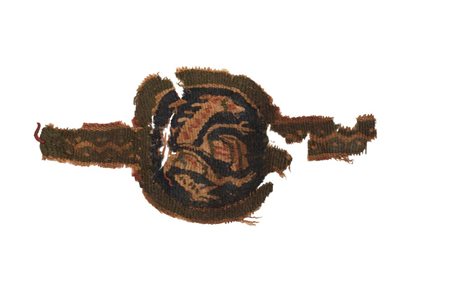 Frammento centrale di clavus, la striscia ricamata che decorava anteriormente le tuniche; entro un bordo circolare si trova un grifone stilizzato con artigli da rapace in atto di attaccare una piccola barca a vela