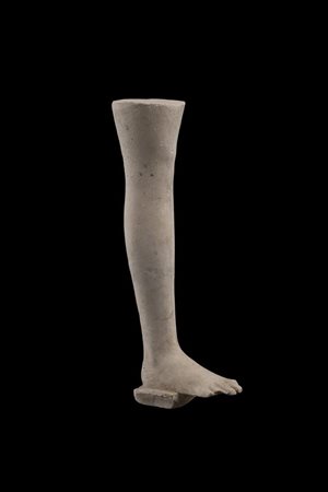 Gamba destra realisticamente modellata con indicazione delle masse muscolari da poco sopra il ginocchio al piede; sotto al piede blocchetto parallelepipedo.