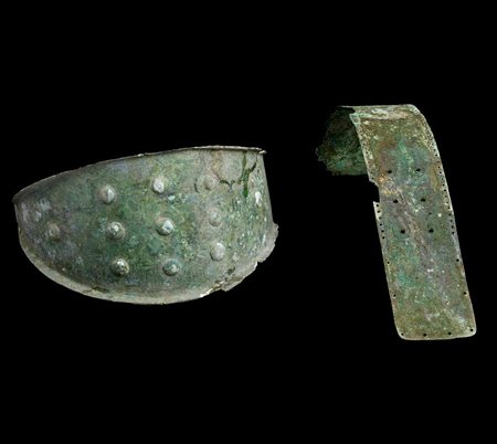 Cinturone di forma ellittica allungata, con estremità fortemente rastremate, con bordi ripiegati all'esterno e due forellini passanti per la chiusura; frammento di cinturone di forma rettangolare con tre coppie di fori per l'inserimento dei ganci di chiusura; lungo i margini serie di piccoli fori per la cucitura del rivestimento (2)