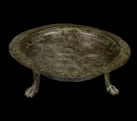 Grande braciere circolare con bordo a tesa e vasca poco profonda, su elegante sostegno con gambe modellate a zampa ferina; decorato sulla tesa con motivi geometrici incisi